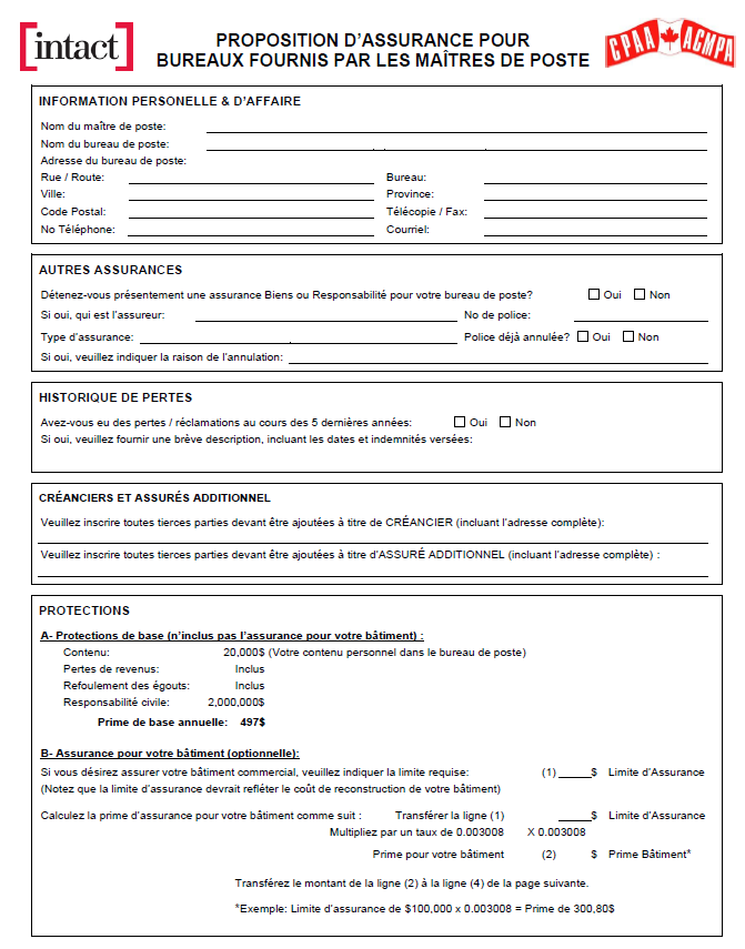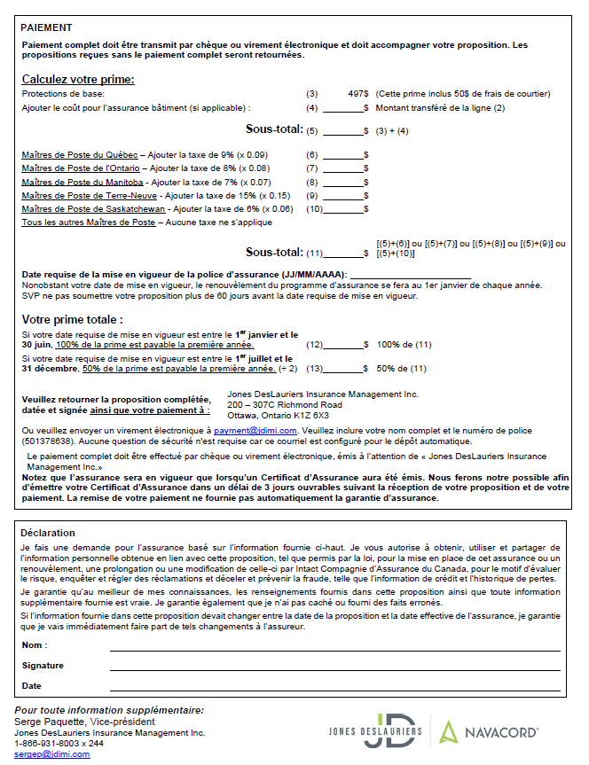 Afin de bénéficier des taux préférentiels, vous devez compléter la proposition et soumettre votre demande à Serge Paquette chez Jones DesLauriers / Navacord (coordonnées à la page 2 du formulaire).