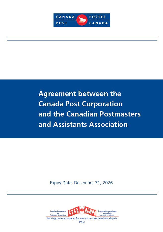 If you are a member of the Canadian Postmasters and Assistants Association, this legally binding document covers everything about your working conditions, your wages, your benefits, etc.